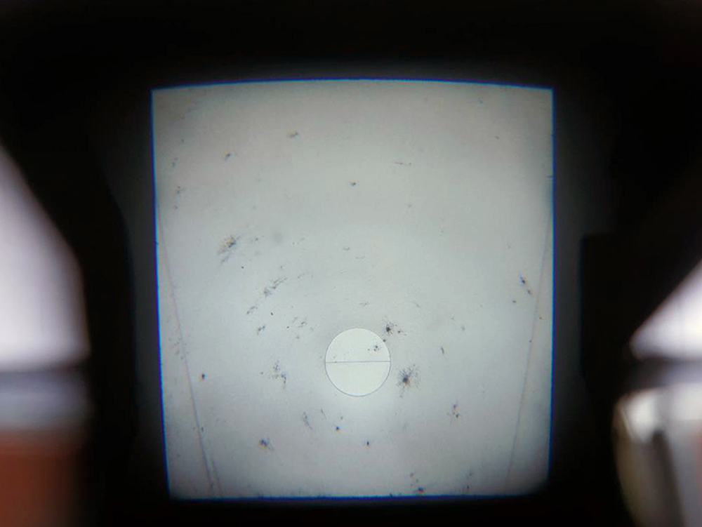 很清晰的霉,是在涅菲尔反光屏上的,前面说过了。镜头、48反光凹镜、18取景反光板上,以及50取景窗透镜上的霉、污渍,从取景里看到的效果,是一片糊糊的感觉。类似于眼镜上的污渍,眼睛能感受到,但是无法清楚形状。