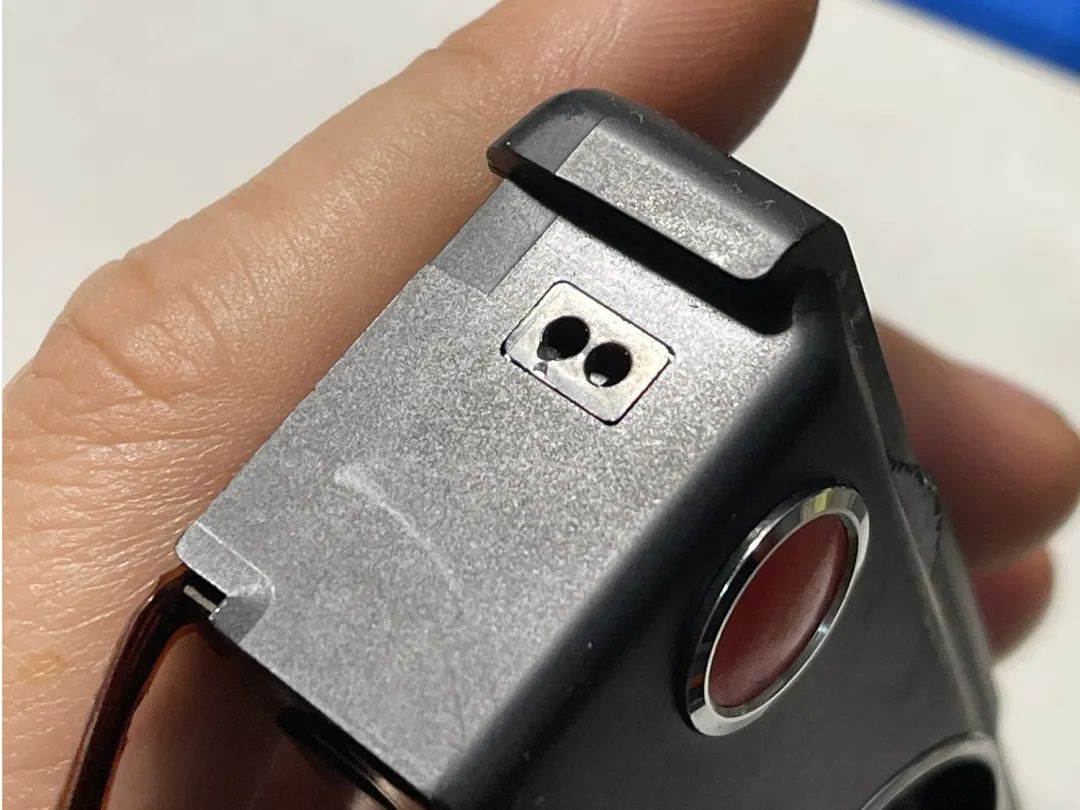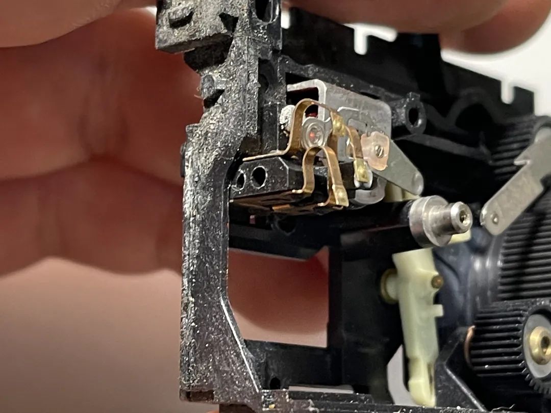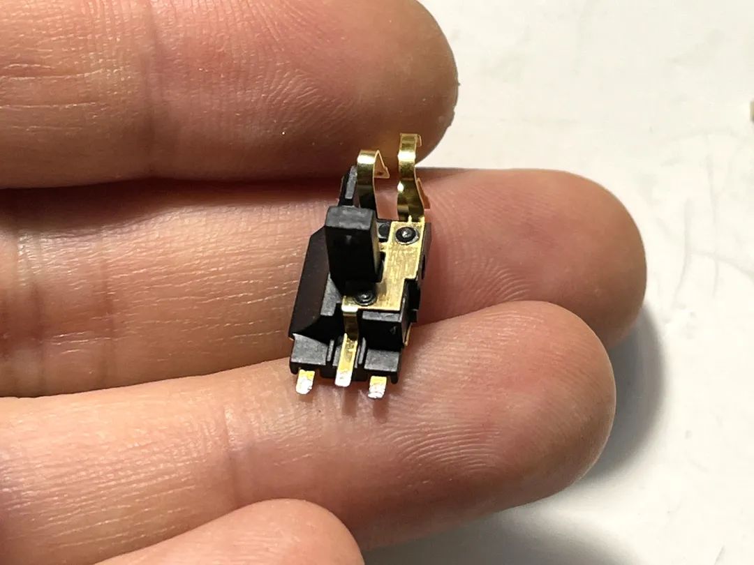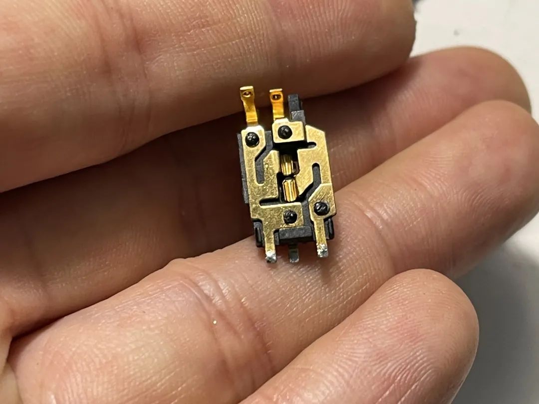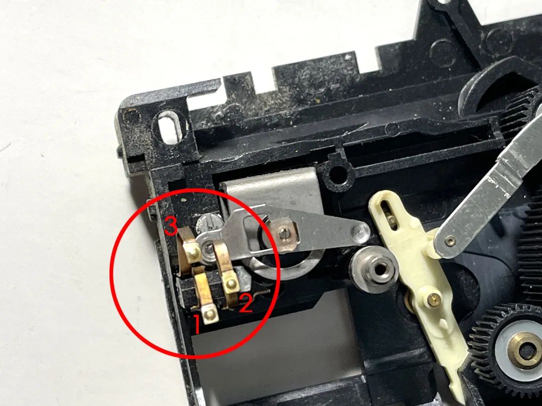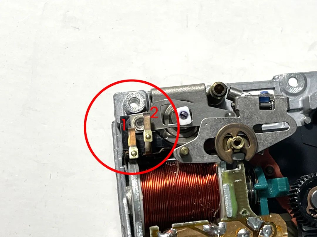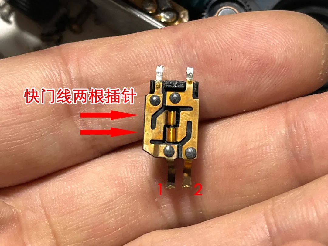 一个常闭结构的开关,两个金属触点连通时触发相机工作。用1、2来表示两个点位。插上快门线,按下开关后1、2联通,触发快门。拆下来长这样: