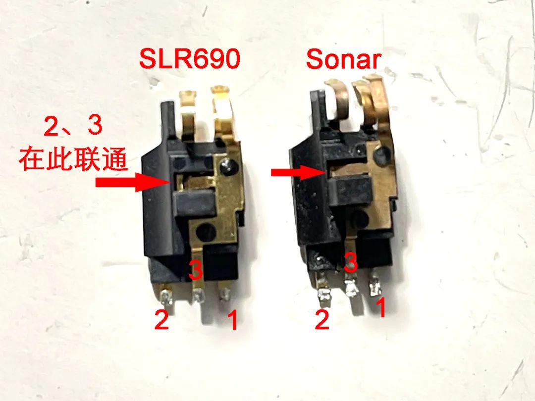 Sonar的快门有三个点位,自动对焦就是轻按快门(1、3点位联通),对好焦之后继续按下去,1、2、3点位联通,触发快门。如果直接联通1、2号位,快门直接触发,和original一样。然后,快门线插口依然只有两个孔,其中3号位和2号是直接联通的。插上快门线后,一根针联通1号位,另外一根针联通2+3号位。