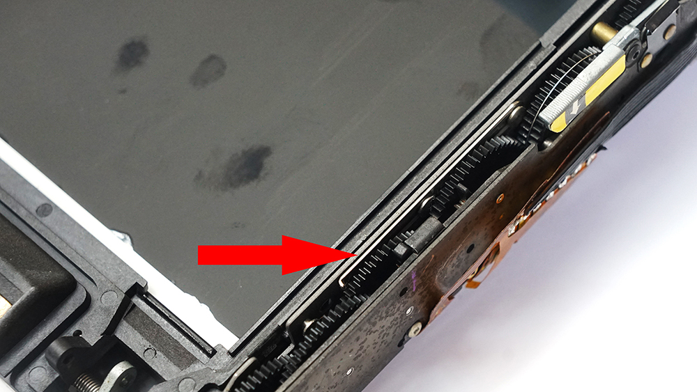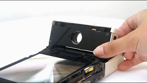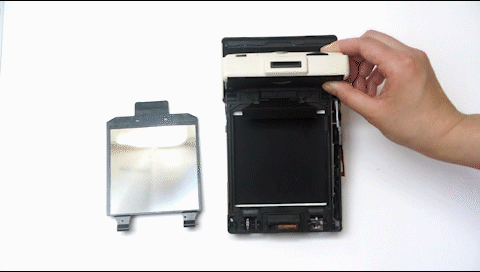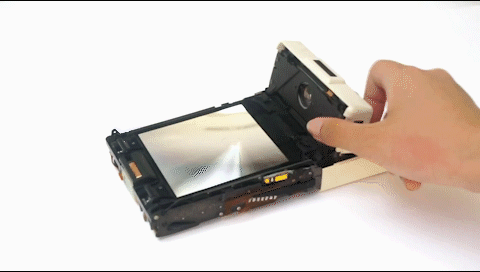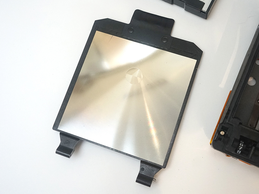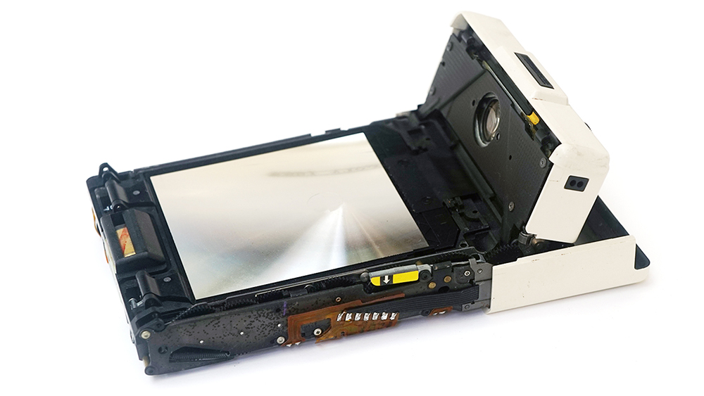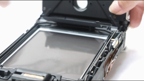 取景屏背面是成像反光板,直接影响成像效果。打开下巴可以从相纸舱看到,轻微灰尘不影响成像。注意不要把手伸进去摸它,一旦弄脏了想要彻底擦干净只能完全拆机。拆到什么程度后面有真相。