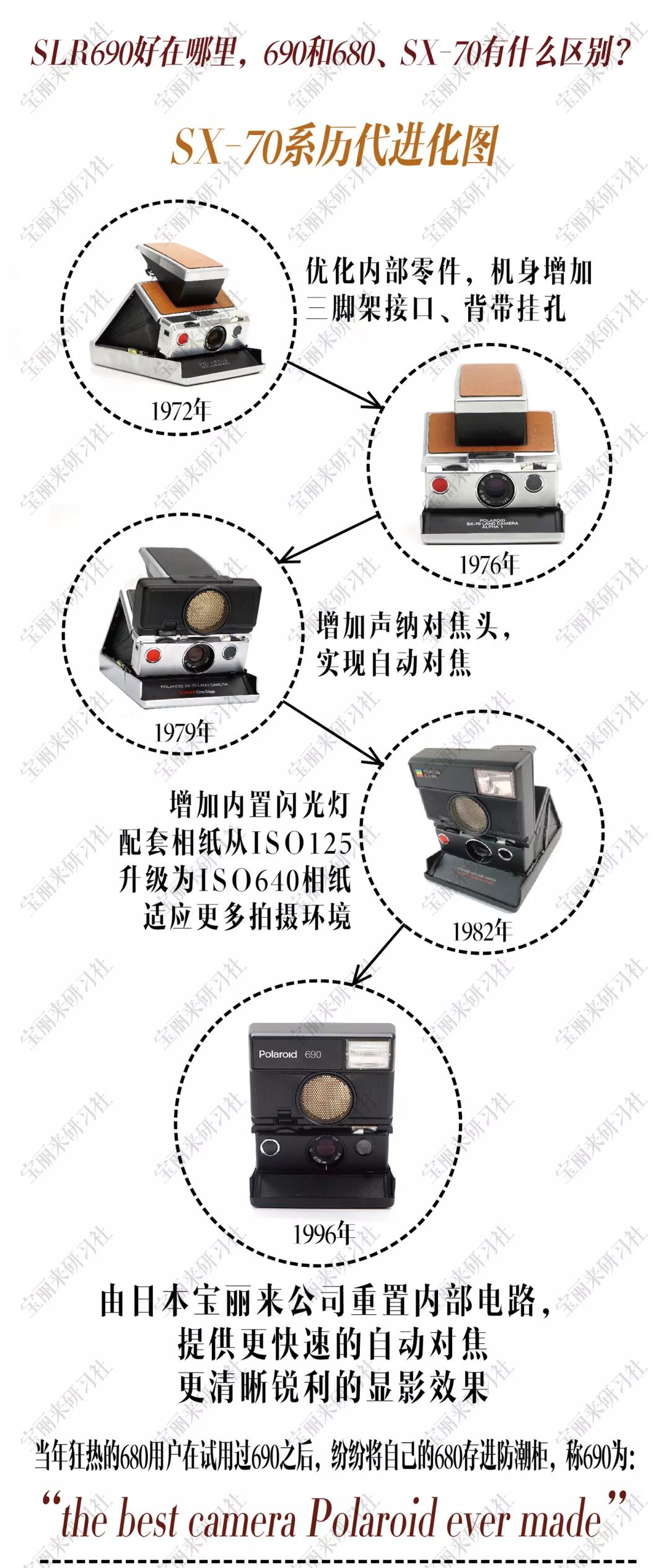 说到这里可以复习一下70进化史:在70的机身上增加声呐头,得到Sonar;在Sonar的机身上增加闪光灯,得到680。6年后日本宝丽来公司用了680的外形,把里面的电路重新排了一遍,得到690。
