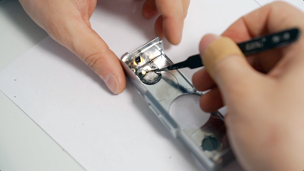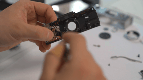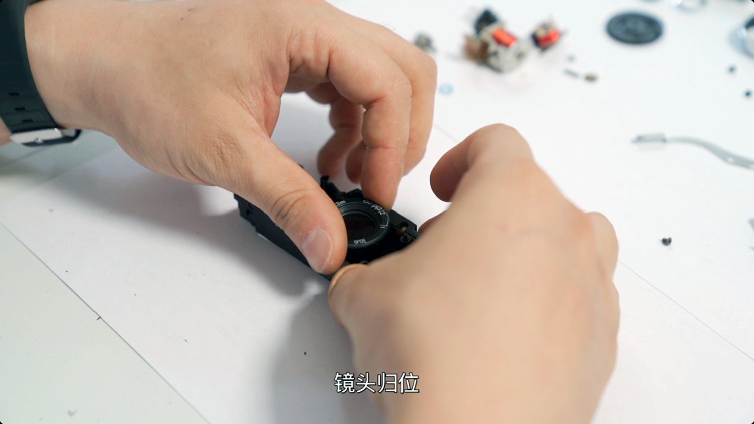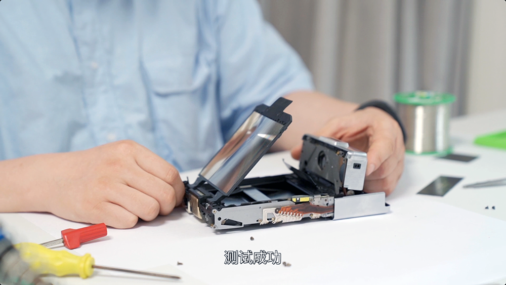 整体组装完毕后,再次测试一下。观察镜头光圈开合以及推片钩运作。