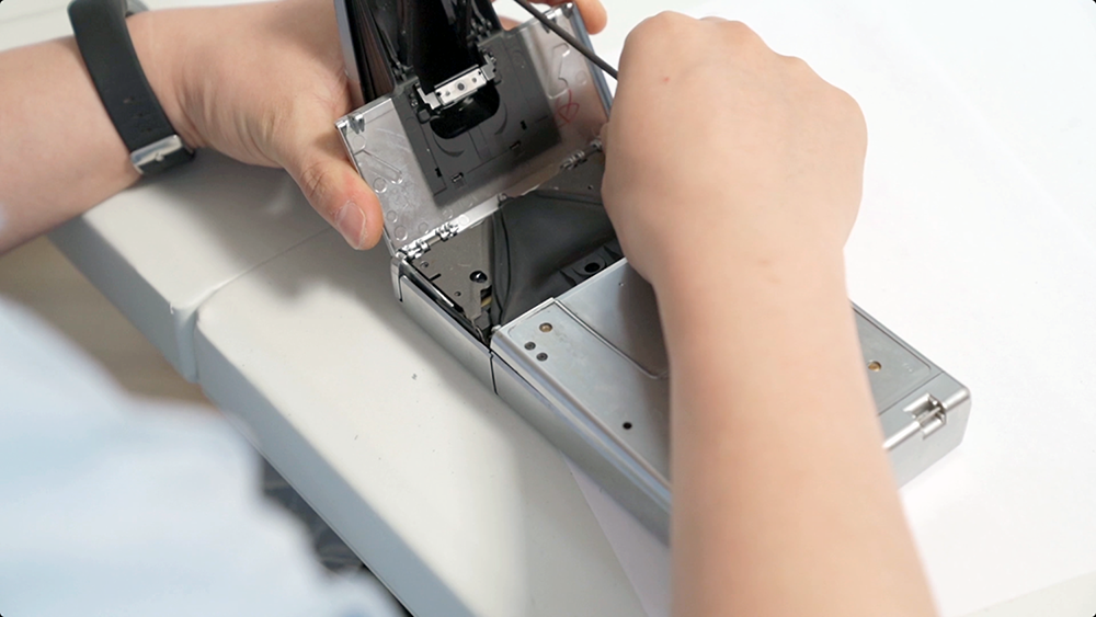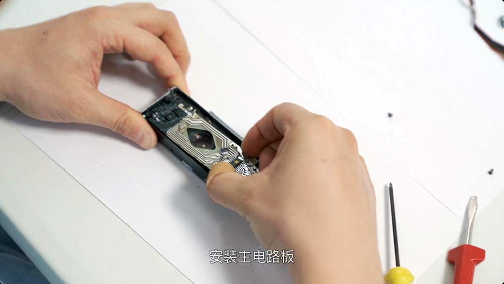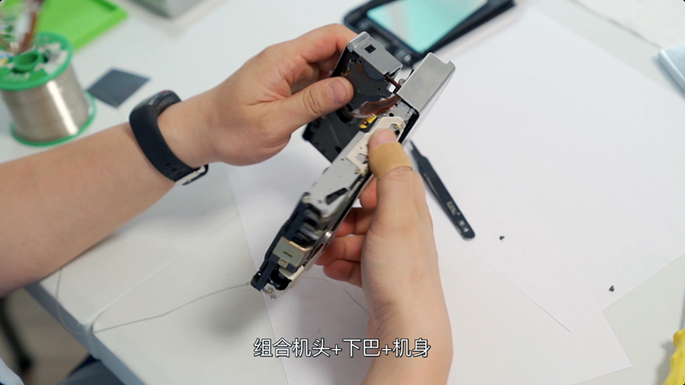 将机头、下巴和机身组合起来,组合好可以测试一下拍摄功能是否正常,可以模拟拍摄。如果没有装好就要拆掉排查故障了。