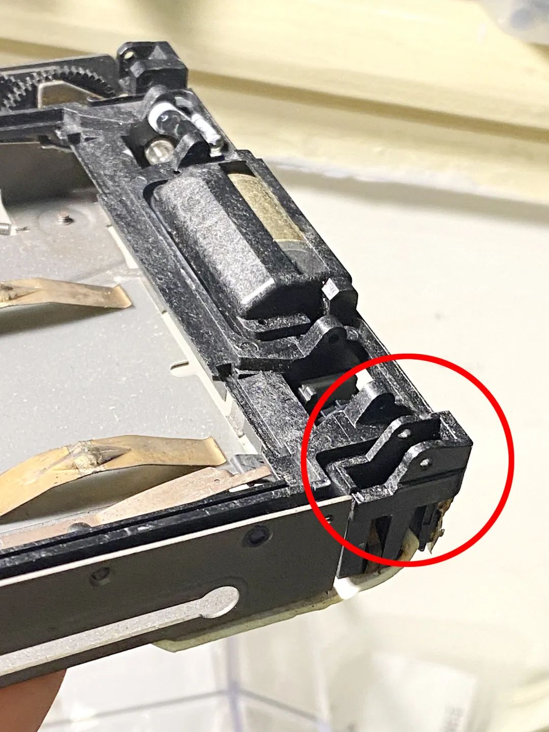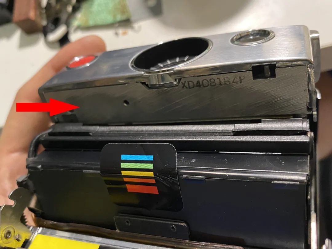 如果相机受到撞击(相机屁股或者头朝下摔到硬地面这种程度),机身左侧这个位置容易断掉(或者机身背板的插销头断掉),临床症状就是装入相纸盒后相机没有任何反应了,黑卡也不吐。