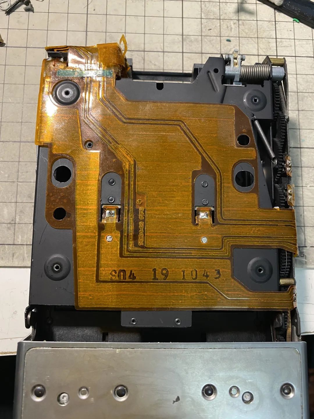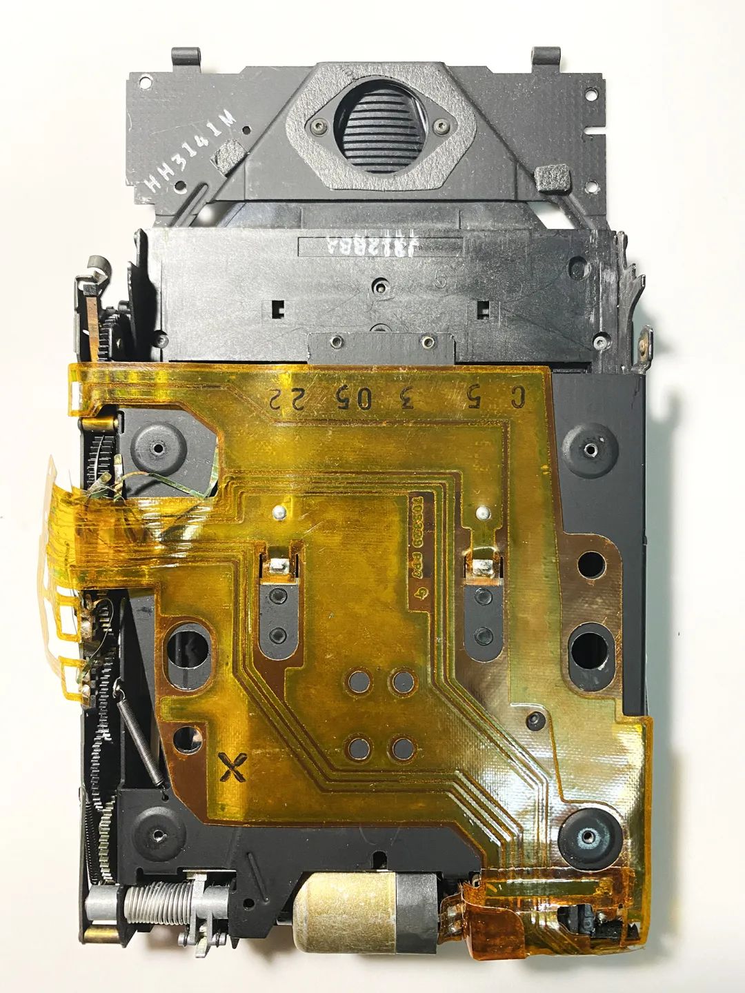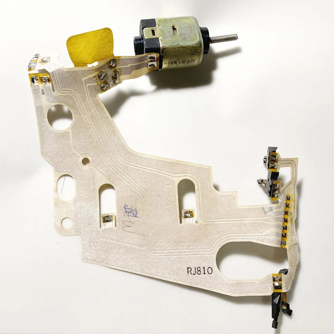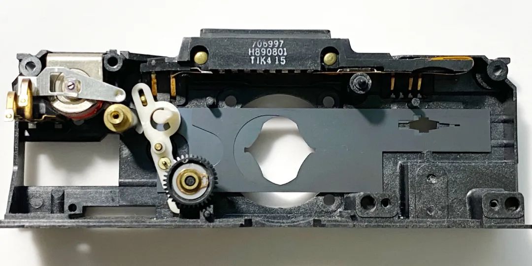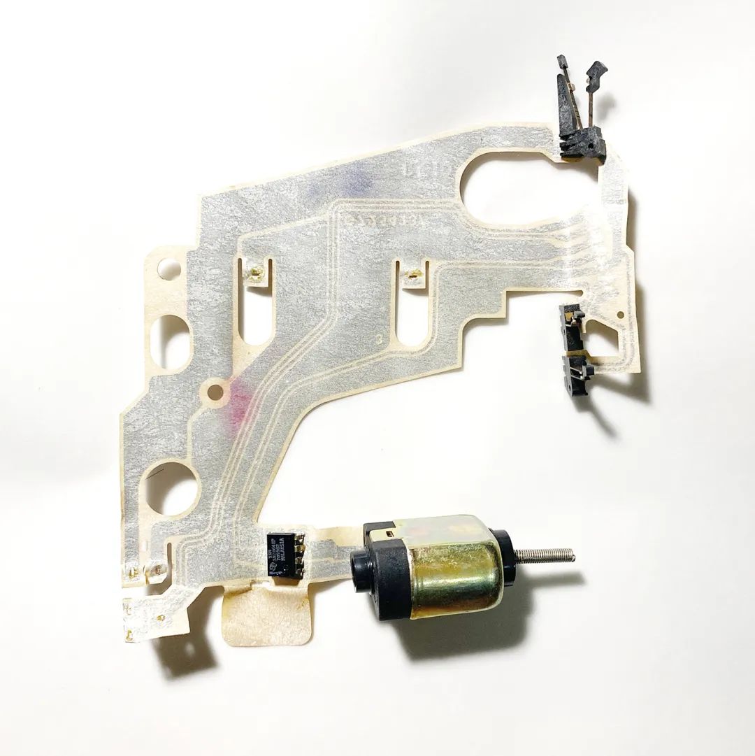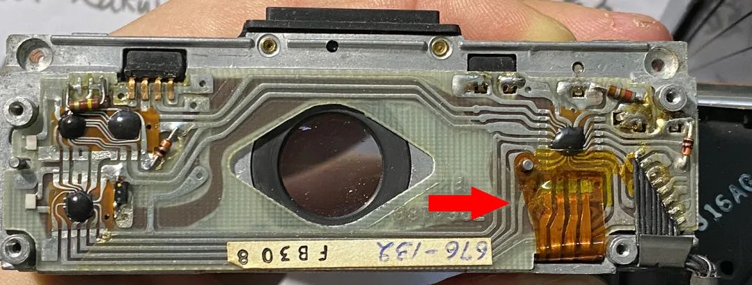 这个电磁铁+早期的光圈页片,包括这块原始电路板,是配套的,和后期的设计都不太一样。注意看它的胶皮排线是8P的,8根线。上周有一台刻度版70送修,就是这个版本,还好我们攒的零件够多,找了一个给它替换,不然整个机头都要换掉了。