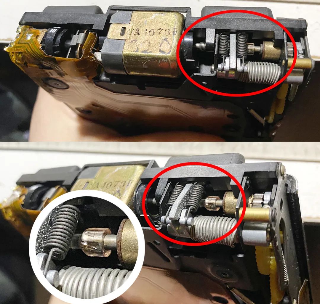 马达轴崩掉的解决办法就是把马达上的弹簧拉长,重新挂上去。十年前我也写过帖子解释,动手能力强的朋友应该都自己搞定了。下图就是一台修过的70,可以看到弹簧头有点大,有拔过的痕迹,长弹簧+短杆: