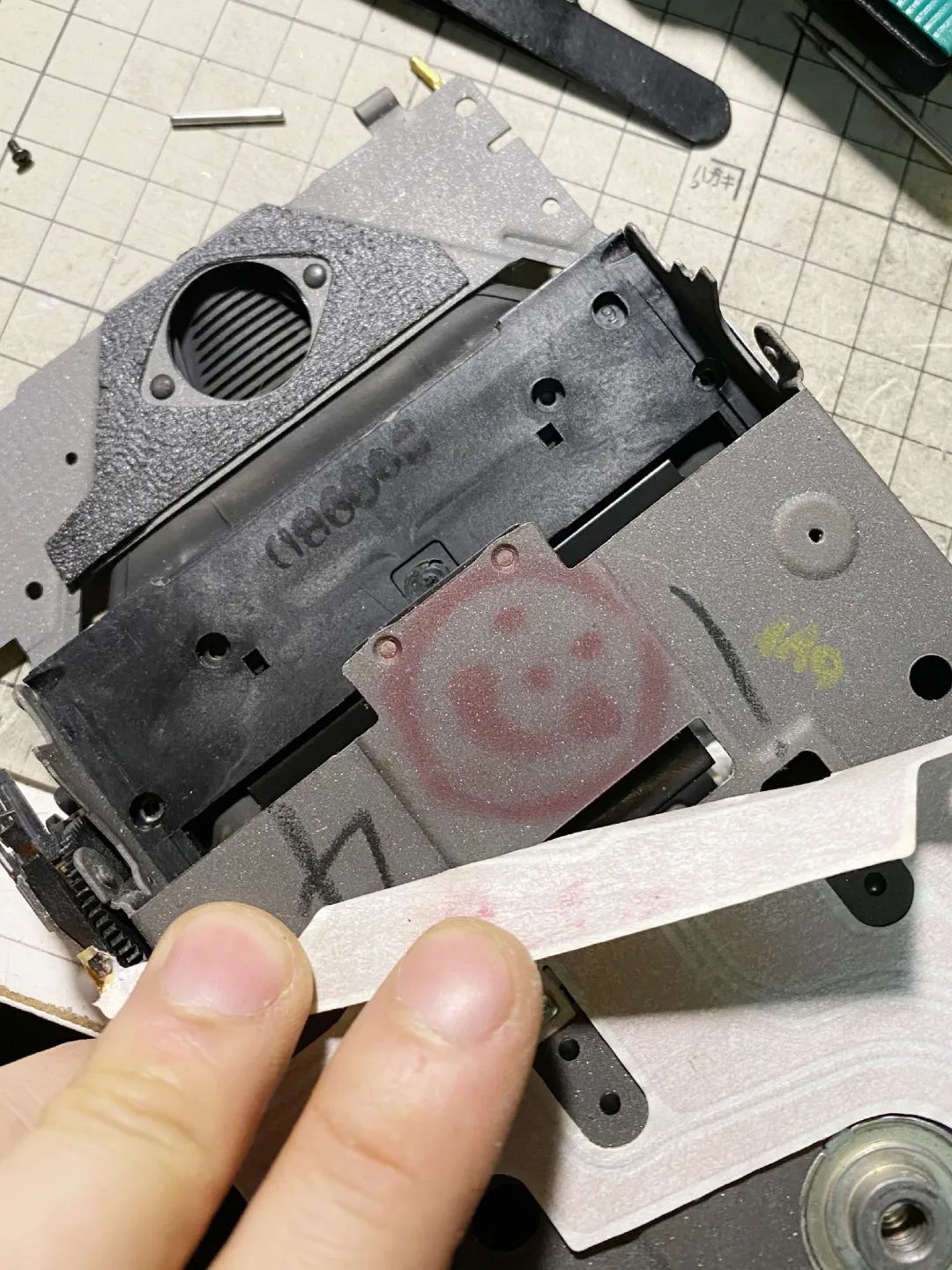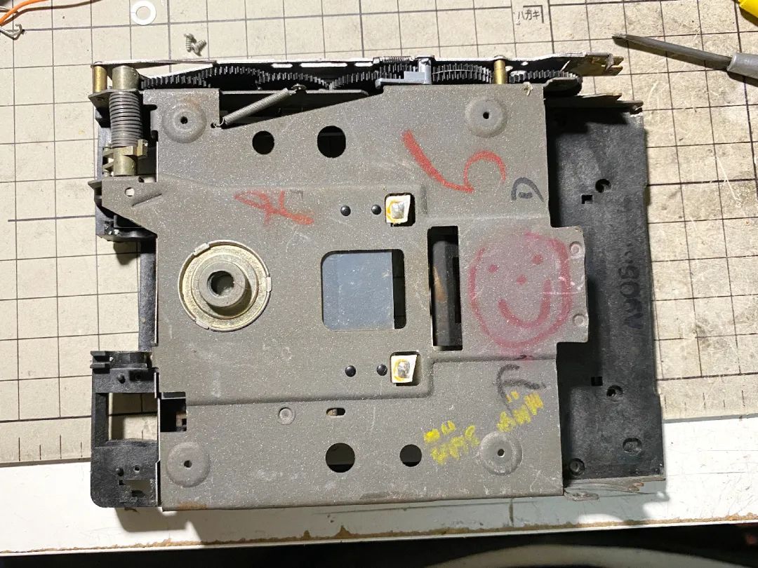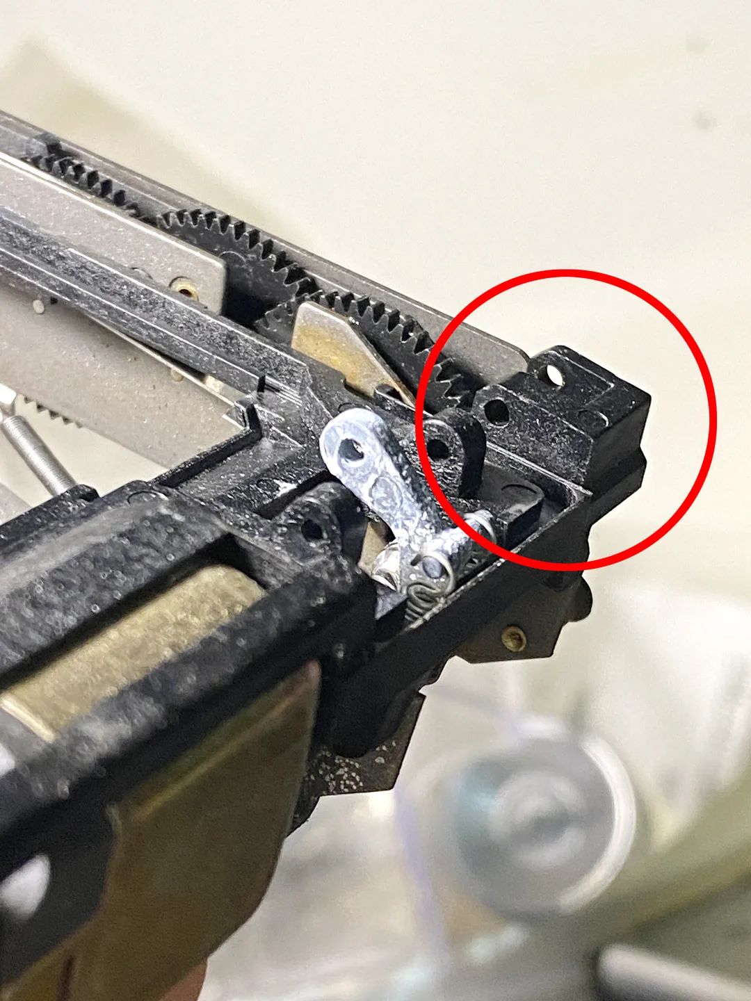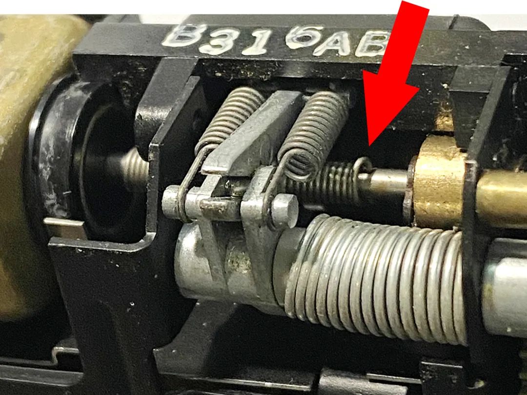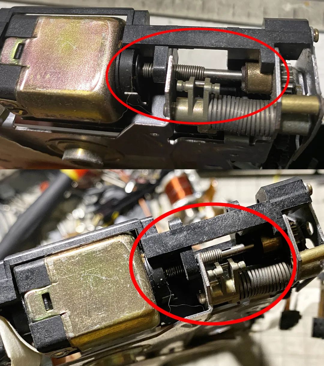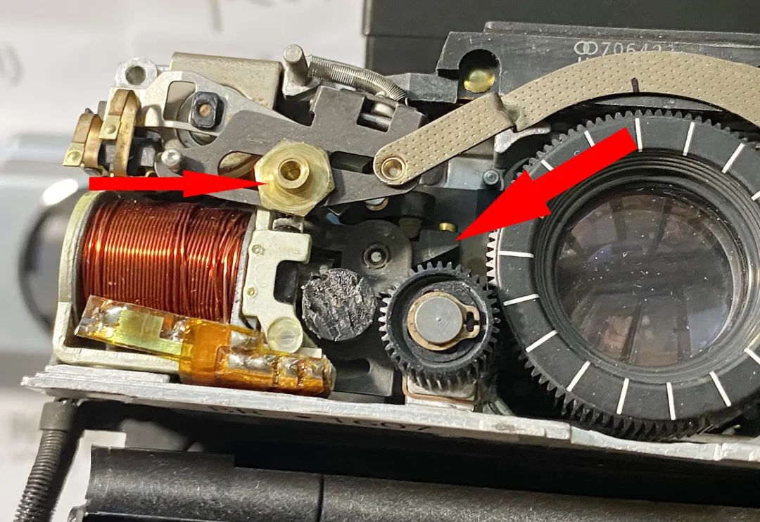 刻度版70这一块的设计是这样的:马达弹簧+马达(塑料)轴+反光板联动杆。中间这个塑料轴是一个设计上的BUG,刻度版70的阑尾,热胀冷缩动不动就崩溃的小可爱。