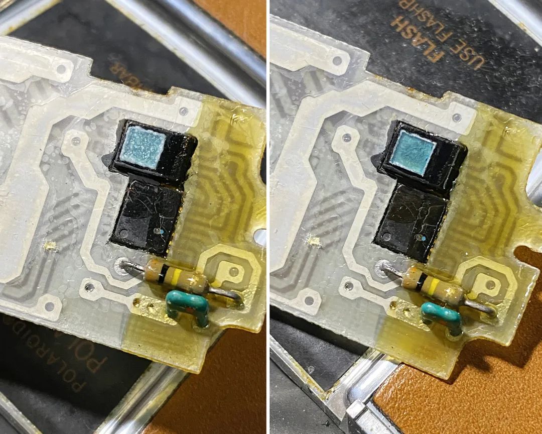 但是后来我又发现一个问题——不是我当年隐瞒没说,是我现在脑子开窍+技术进步了……马达弹簧拉长后,力矩会变长,马达需要提供更大的扭矩力,but很不幸,早期的马达驱动控制器(MOS驱动器)因为老化(也可能它这个型号本身设计参数就不行),有一小部分机子提供不了这么大的驱动力(输出电流不够吧),会导致反光板无力弹起。表示在拍照中的症状是:按下快门后,光圈闭合(取景器会黑掉),你感觉反光板动了一下,然后没有继续动,机子处于假死状态,再按快门也没有反应,如果用力上下摇晃机身(可能)可以把反光板摇上去,之后相纸会进行拍摄吐一张照片出来。因为摇晃,这张照片最后基本上是一张白花花的糊片。