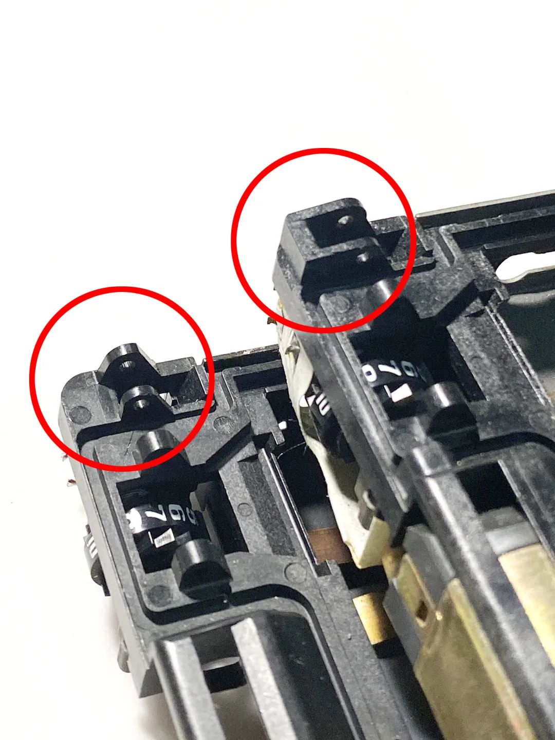 仔细观察可以看到背板插销断掉了(上面箭头所指上下两处白色),机身不通电。