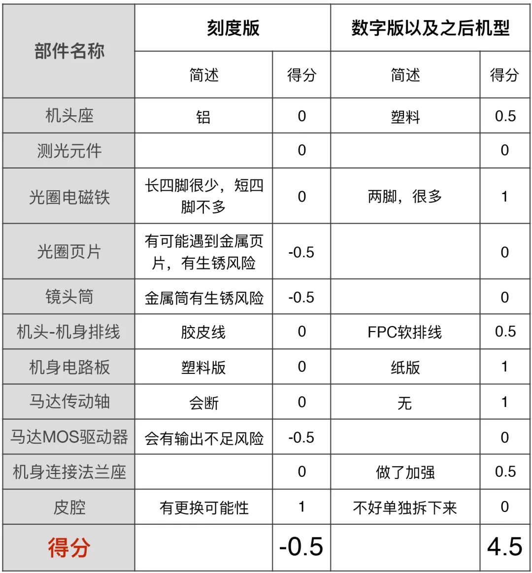 我列了一个表格,分别给它们打分。打分原则:配置相同(故障率相当)不得分;两者相比明显更优的加1分,有一点优势+0.5分,有一点劣势的-0.5分。