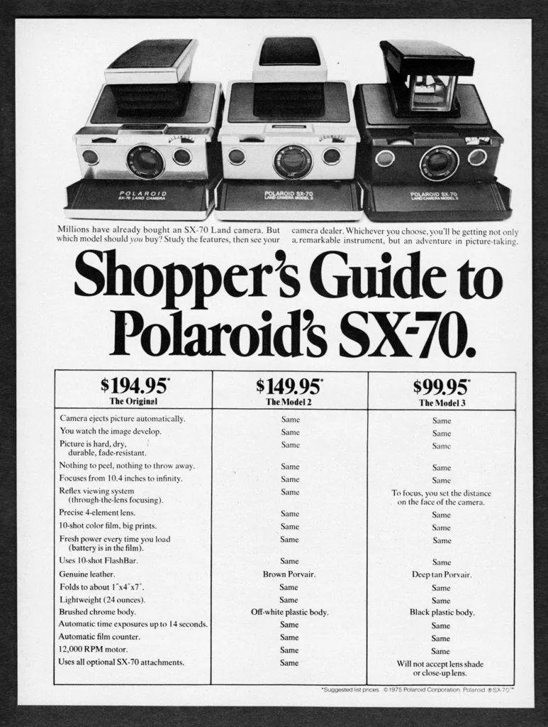 仔细对比官方给的参数,Model2与Original之间的区别仅仅是贴皮不是真皮,以及塑料机壳没有镀金属,就便宜了45刀(当年价格)——这个差价和现在的市价也差不多,差500块钱。SX-70系里面性价比最高的就是Model2了,里外保养好重新贴皮的Model2白机、黑机是实用主义者不二之选。