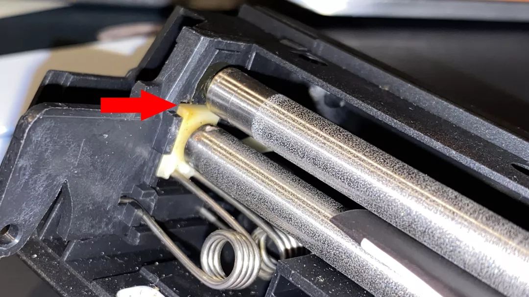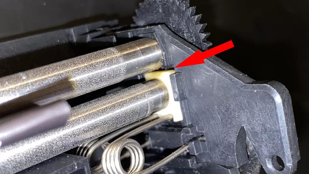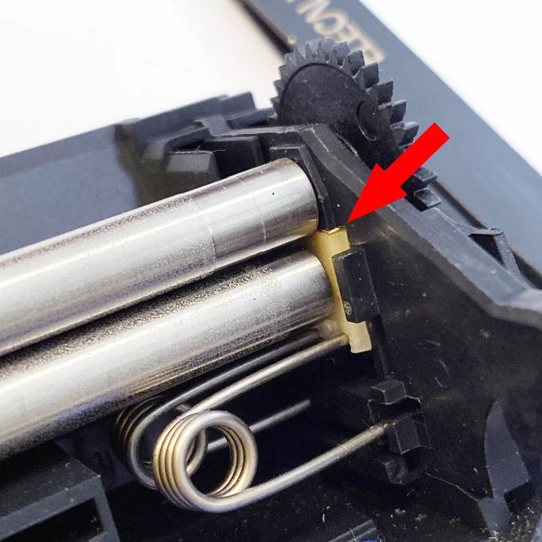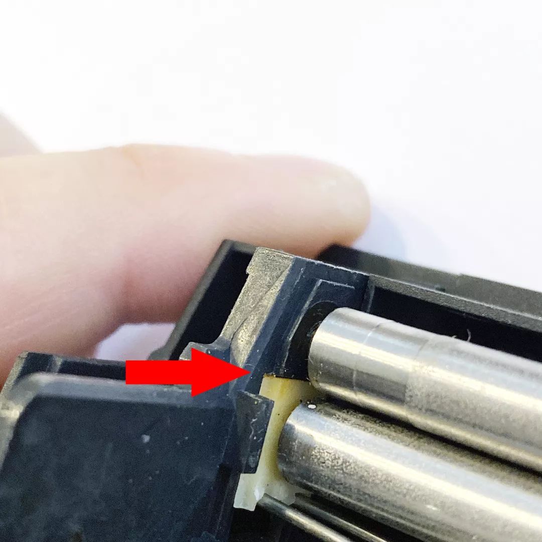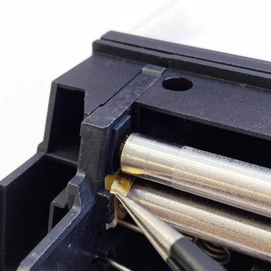 用镊子把刚才做的两小片铜箔,塞到下图红箭头所指的滚轴白色座和灰色座之间即可。