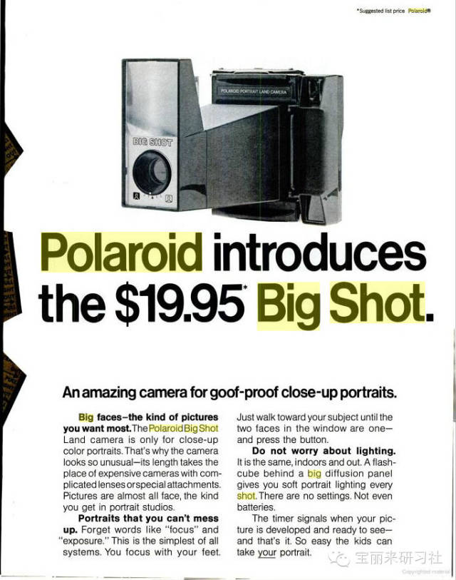 Big Shot诞生于1971年,当时的售价是19.95美金,这台相机就是被设计来拍摄人像的,固定焦距固定光圈固定快门,因为是固定焦距,所以需要摄影师前后移动自己跟被拍摄者的距离来进行对焦,这种方法也被戏称为"Big Shot Shuffle”。