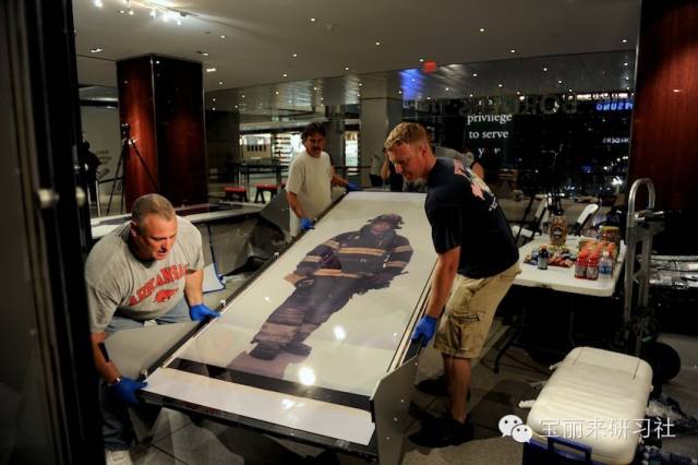 4、摄影师在黑暗中揭开镜头墙上的镜头盖,触发闪灯系统,完成拍摄。之后技师操作显影过程,90秒后揭开底片,得到巨幅照片。
