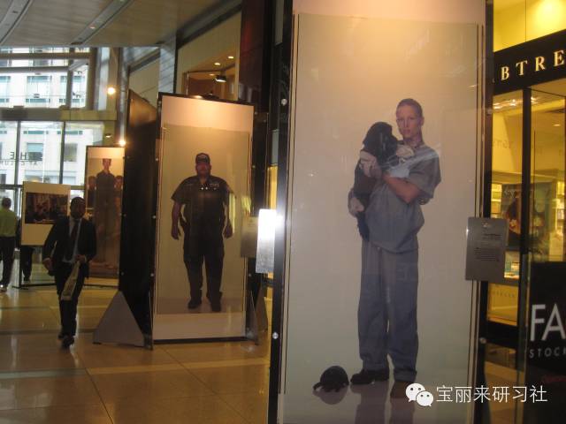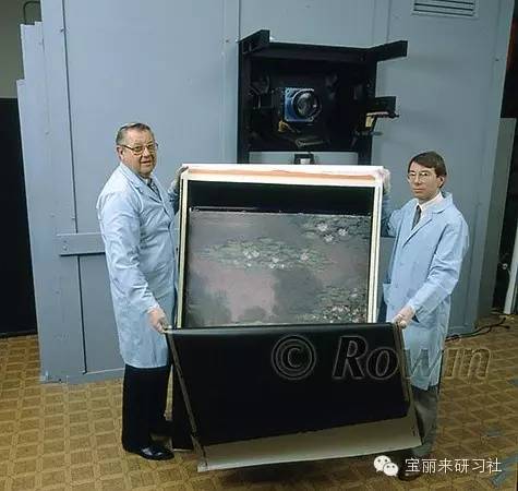 上图:两位技师正在展示用宝丽来40X80复制的莫奈作品《睡莲》。身后墙板上镶嵌着的是40X80的镜头。摄于波士顿美术馆。