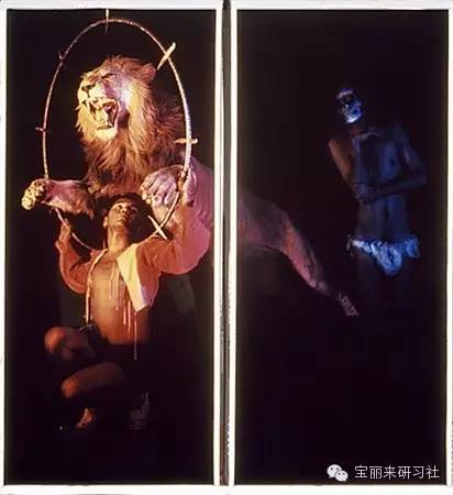 上图选自《Cirque Series》系列,拍摄于1990年,名为《The Lion, The Hoop-handler, and The Clown Death》,折合式双连画。