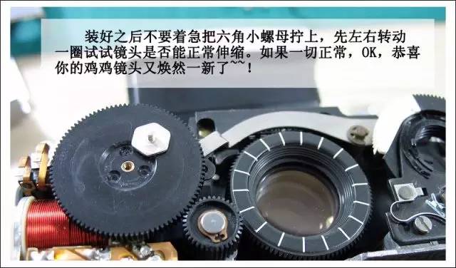 装好之后不要着急把螺母拧上,左右转动旋钮,看看镜头是否能正常伸缩。如果一切正常,镜头不会掉出来,OK,恭喜你成功了~