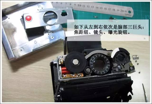 面板取走后就是SX-70脑袋的内部了。从左到右依次是焦距旋钮、镜头、曝光旋钮。